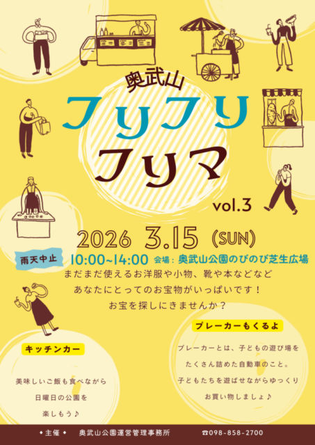 新年度や新生活を前に、心も持ち物もすっきり整えたくなる季節。奥武山公園のびのび芝生広場で開催される奥武山フリフリフリマは、まだまだ使えるお洋服や小物、靴や本などが並ぶフリーマーケットイベントです。だれかの不要なものが、あなたにとっての宝物になるかもしれない、そんな出会いが生まれる一日。キッチンカーも登場し、青空の下でお買い物とグルメをゆったり楽しめます。