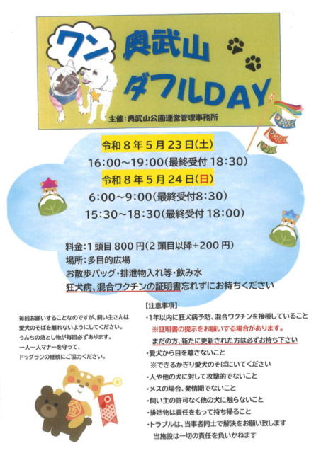 5月のドッグランとして、多目的広場で開催されます。5月23日(土)は夕暮れランのみと案内されています。参加時は、お散歩バッグ・排泄物入れ等・飲み水、狂犬病、混合ワクチンの証明書の持参が必要です。